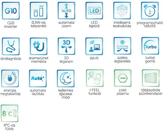 Felszerelés és beüzemelés díja bruttó 55.000 Ft, mely tartalmazza a kiszállást, a készülék helyszínre szállítását, a kültéri és beltéri egység felszerelését, elektromos betáp kiépítését aljzatba max. 5 méterig*, a kültéri tartókonzolt, rögzítő elemeket, a vákuumozást, a berendezés beüzemelését és azzal kapcsolatos dokumentumok kitöltését (pl.: beüzemelési jegyzőkönyv, garanciajegy...), valamint a takarítást.