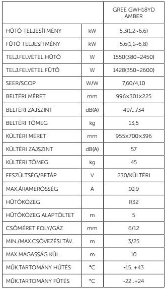 - Hűtő teljesítmény : 5,3 (1,3-6,6) kW